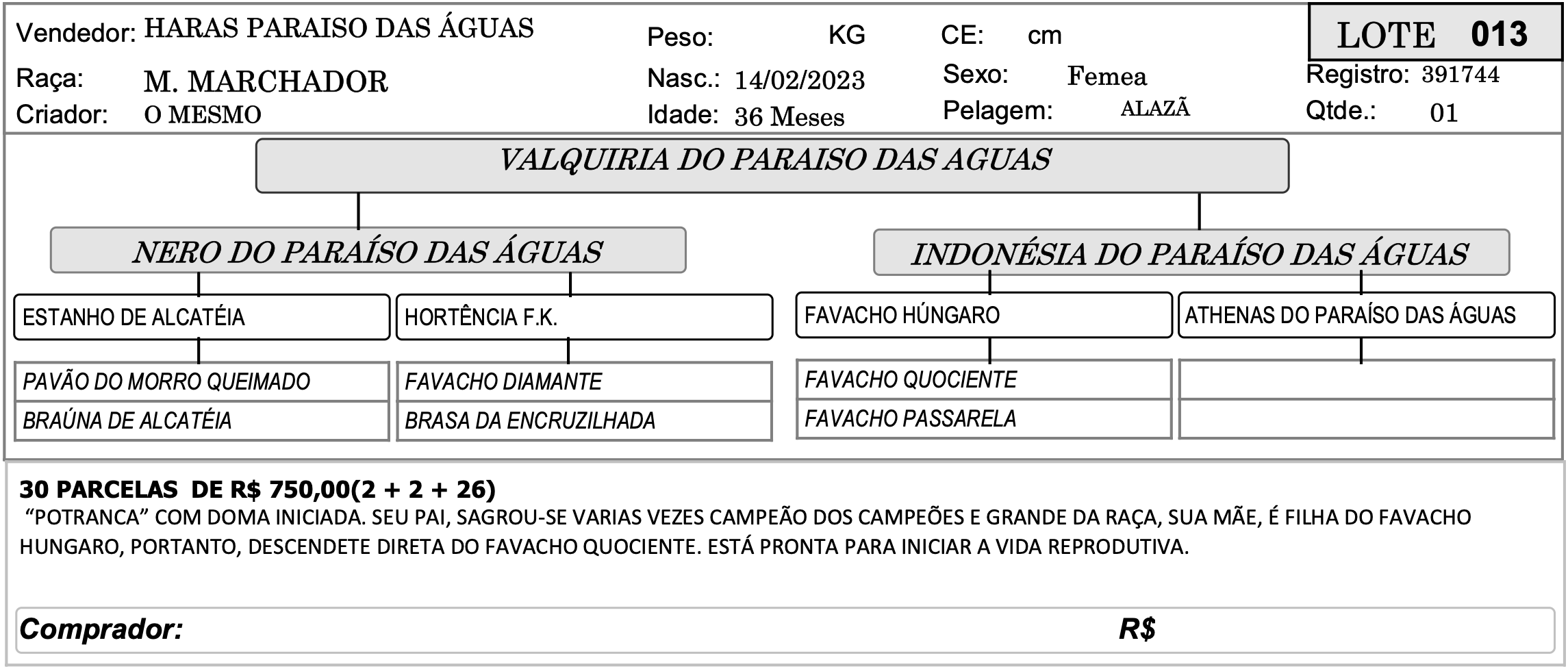 LOTE 013 - VALQUIRIA DO PARAISO DAS AGUAS 4º SHOPPING CRIAÇÃO - HARAS PARAÍSO DAS ÁGUAS 14 Valor da parcela:R$750 Ocultar formulário Buy Now Ao fazer uma oferta você concorda com os nossos termos e condições dispostos no site Inserir os termos e condições do Evento para o Lance!!!! Confirmar Lance Descrição Categoria 4º SHOPPING CRIAÇÃO - HARAS PARAÍSO DAS ÁGUAS « LOTE 012 - VIOLETA DO PARAÍSO DAS ÁGUAS LOTE 014 - VIOLA DO PARAÍSO DAS ÁGUAS »