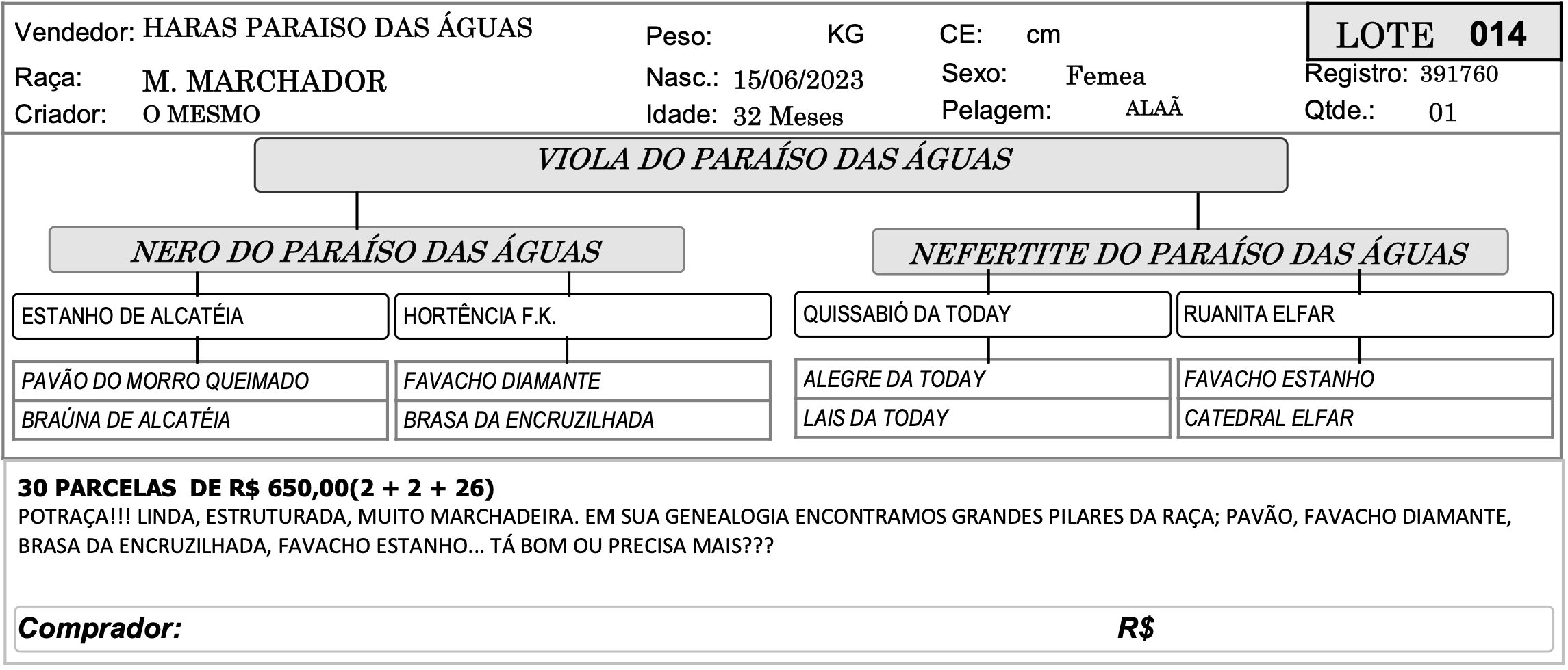 LOTE 014 - VIOLA DO PARAÍSO DAS ÁGUAS 4º SHOPPING CRIAÇÃO - HARAS PARAÍSO DAS ÁGUAS 10 Valor da parcela:R$650 Ocultar formulário Buy Now Ao fazer uma oferta você concorda com os nossos termos e condições dispostos no site Inserir os termos e condições do Evento para o Lance!!!! Confirmar Lance Descrição Categoria 4º SHOPPING CRIAÇÃO - HARAS PARAÍSO DAS ÁGUAS « LOTE 013 - VALQUIRIA DO PARAISO DAS AGUAS LOTE 015 - URBANA DO PARAÍSO DAS ÁGUAS »