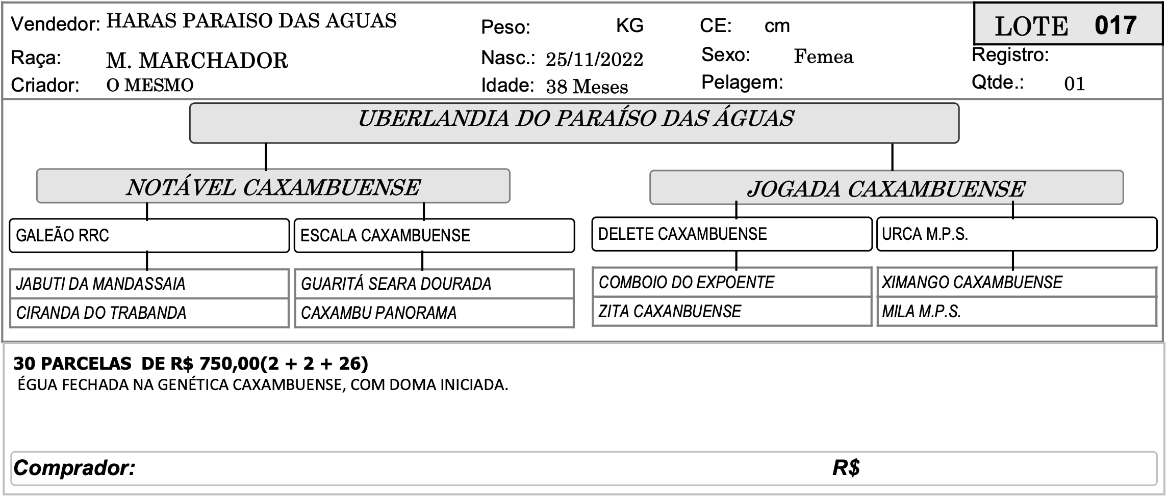 LOTE 017 - UBERLANDIA DO PARAÍSO DAS ÁGUAS 4º SHOPPING CRIAÇÃO - HARAS PARAÍSO DAS ÁGUAS 8 Valor da parcela:R$750 Ocultar formulário Buy Now Ao fazer uma oferta você concorda com os nossos termos e condições dispostos no site Inserir os termos e condições do Evento para o Lance!!!! Confirmar Lance Descrição Categoria 4º SHOPPING CRIAÇÃO - HARAS PARAÍSO DAS ÁGUAS « LOTE 016 - VALERIA DO PARAÍSO DAS ÁGUAS LOTE 018 - ULTRAVIOLETA DO PARAÍSO DAS ÁGUAS »