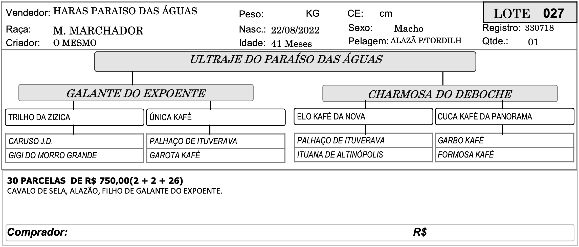 LOTE 027 - ULTRAJE DO PARAÍSO DAS ÁGUAS 4º SHOPPING CRIAÇÃO - HARAS PARAÍSO DAS ÁGUAS 8 Valor da parcela:R$750 Ocultar formulário Buy Now Ao fazer uma oferta você concorda com os nossos termos e condições dispostos no site Inserir os termos e condições do Evento para o Lance!!!! Confirmar Lance Descrição Categoria 4º SHOPPING CRIAÇÃO - HARAS PARAÍSO DAS ÁGUAS « LOTE 026 - UNIVERSO DO PARAÍSO DAS ÁGUAS LOTE 028 - UBIRACY DO PARAÍSO DAS ÁGUAS »