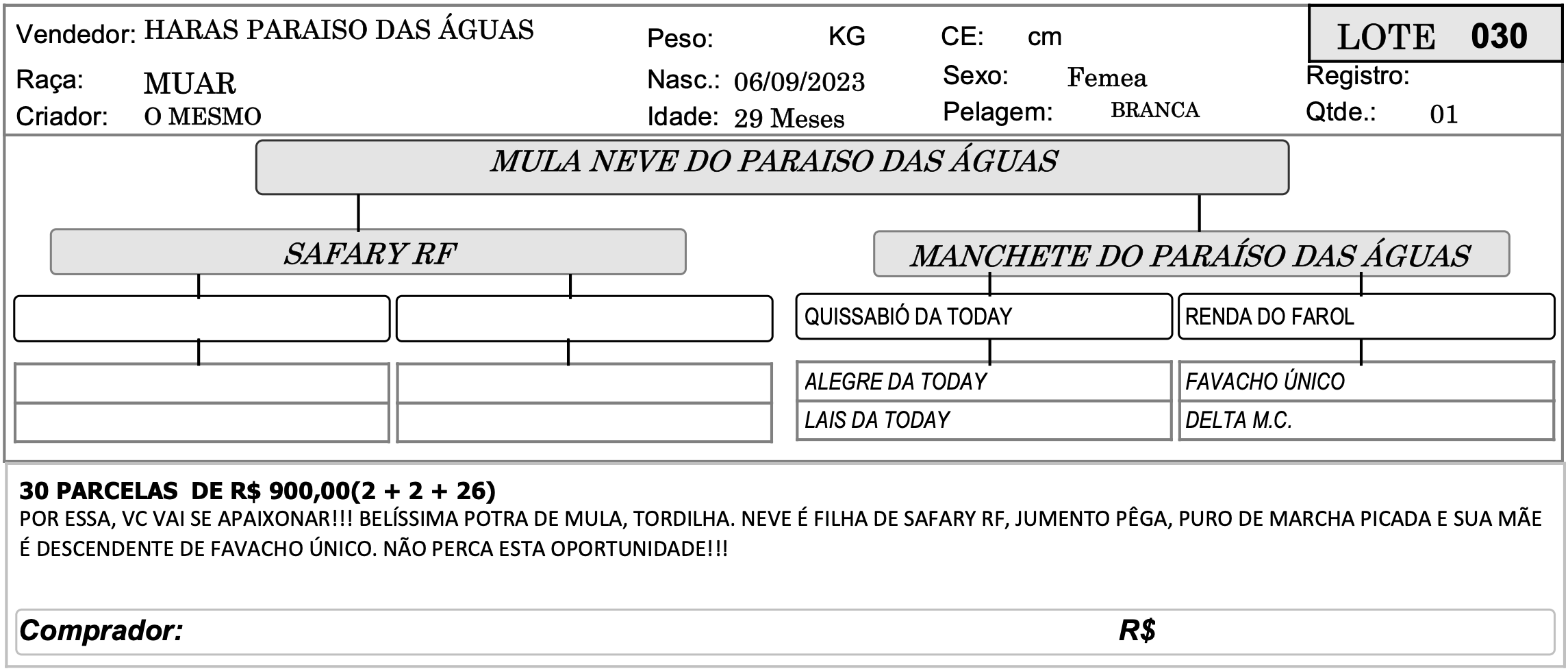 LOTE 030 - MULA NEVE DO PARAISO DAS ÁGUAS 4º SHOPPING CRIAÇÃO - HARAS PARAÍSO DAS ÁGUAS 5 Valor da parcela:R$900 Ocultar formulário Buy Now Ao fazer uma oferta você concorda com os nossos termos e condições dispostos no site Inserir os termos e condições do Evento para o Lance!!!! Confirmar Lance Descrição Categoria 4º SHOPPING CRIAÇÃO - HARAS PARAÍSO DAS ÁGUAS « LOTE 029 - QUADRADO DO PARAISO DAS ÁGUAS LOTE 031 - MULA MALÁSIA DO PARAISO DAS ÁGUAS »