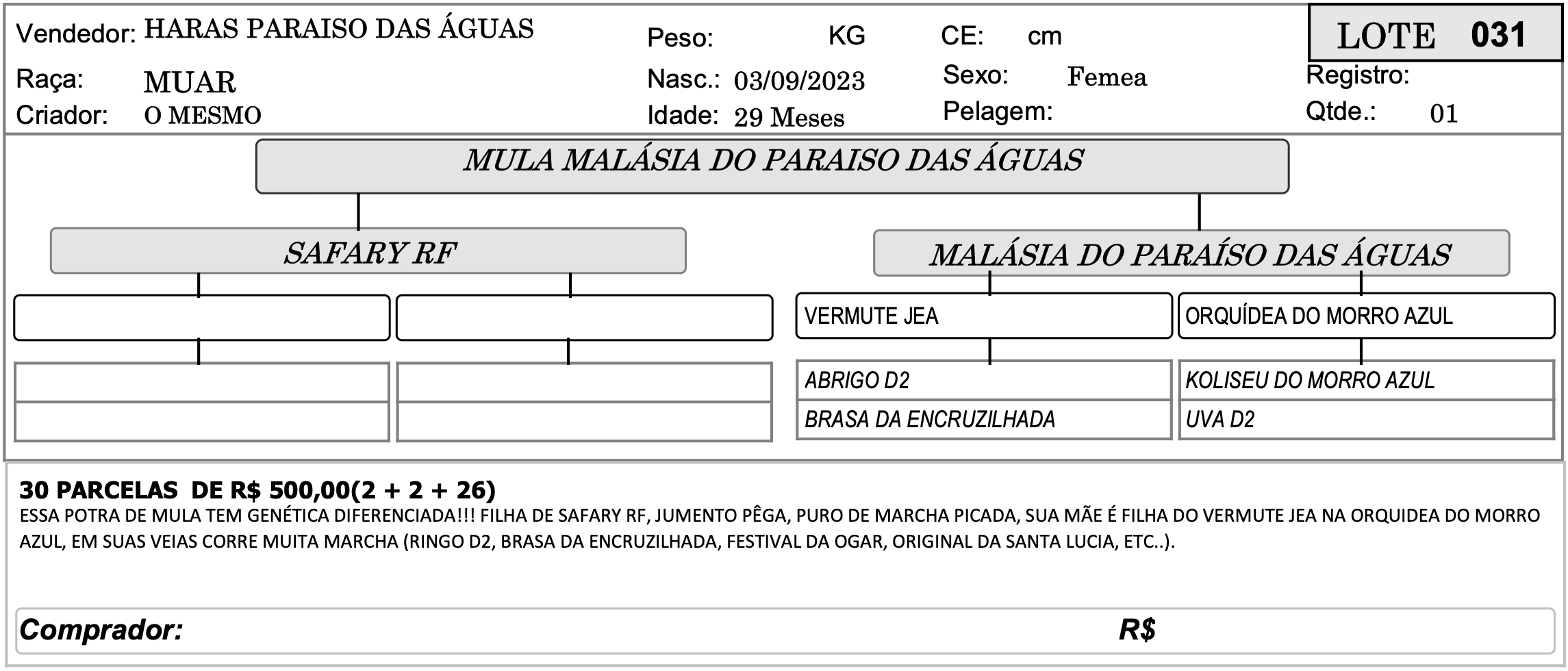 LOTE 031 - MULA MALÁSIA DO PARAISO DAS ÁGUAS 4º SHOPPING CRIAÇÃO - HARAS PARAÍSO DAS ÁGUAS 5 Valor da parcela:R$500 Ocultar formulário Buy Now Ao fazer uma oferta você concorda com os nossos termos e condições dispostos no site Inserir os termos e condições do Evento para o Lance!!!! Confirmar Lance Descrição Categoria 4º SHOPPING CRIAÇÃO - HARAS PARAÍSO DAS ÁGUAS « LOTE 030 - MULA NEVE DO PARAISO DAS ÁGUAS LOTE 032 - MULA MALICIA DO PARAISO DAS ÁGUAS »