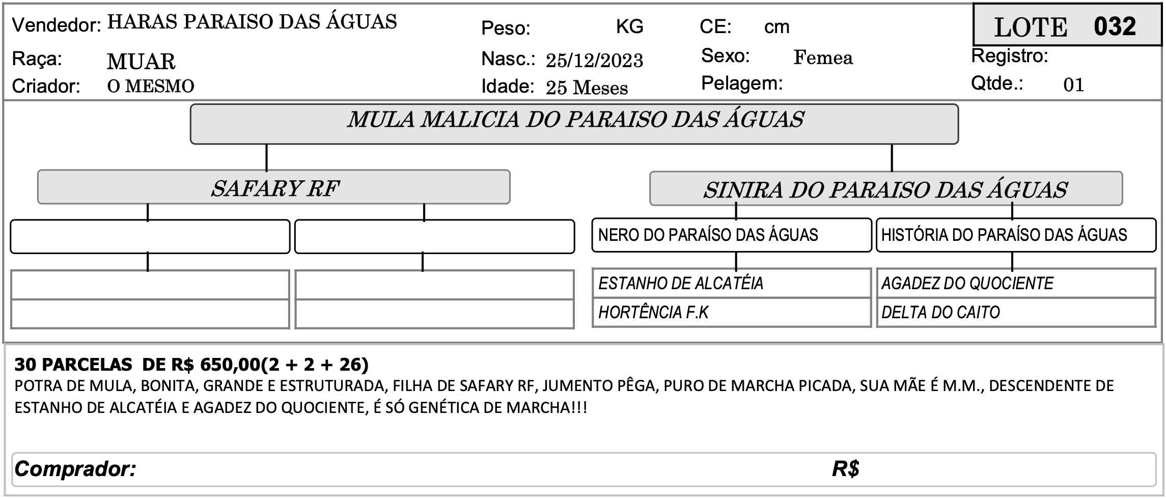 LOTE 032 - MULA MALICIA DO PARAISO DAS ÁGUAS 4º SHOPPING CRIAÇÃO - HARAS PARAÍSO DAS ÁGUAS 8 Valor da parcela:R$650 Ocultar formulário Buy Now Ao fazer uma oferta você concorda com os nossos termos e condições dispostos no site Inserir os termos e condições do Evento para o Lance!!!! Confirmar Lance Descrição Categoria 4º SHOPPING CRIAÇÃO - HARAS PARAÍSO DAS ÁGUAS « LOTE 031 - MULA MALÁSIA DO PARAISO DAS ÁGUAS LOTE 033 - BURRO PINGENTE DO PARAISO DAS ÁGUAS »
